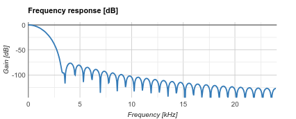 Para la demostración de la funcionalidad el filtro en C, se generó un filtro haciendo uso de FIIR, que permite generar coeficientes para filtros arbitrarios con frecuencias de muestreo y filtrado determinadas. Para esta demostración se generó un FIR cuya respuesta al impulso coincide con un seno cardinal (sinc), con una frecuencia de muestreo de 48kHz, una frecuencia de cutoff de 800Hz y un ancho de banda de transición de 3840Hz, el cual observando su respuesta en frecuencia, tenemos que genera una atenuación de 35dB a 0.1 frecuencia relativa a la de Nyquist, es decir ((0.1)Fs/2 = 2.4kHz).